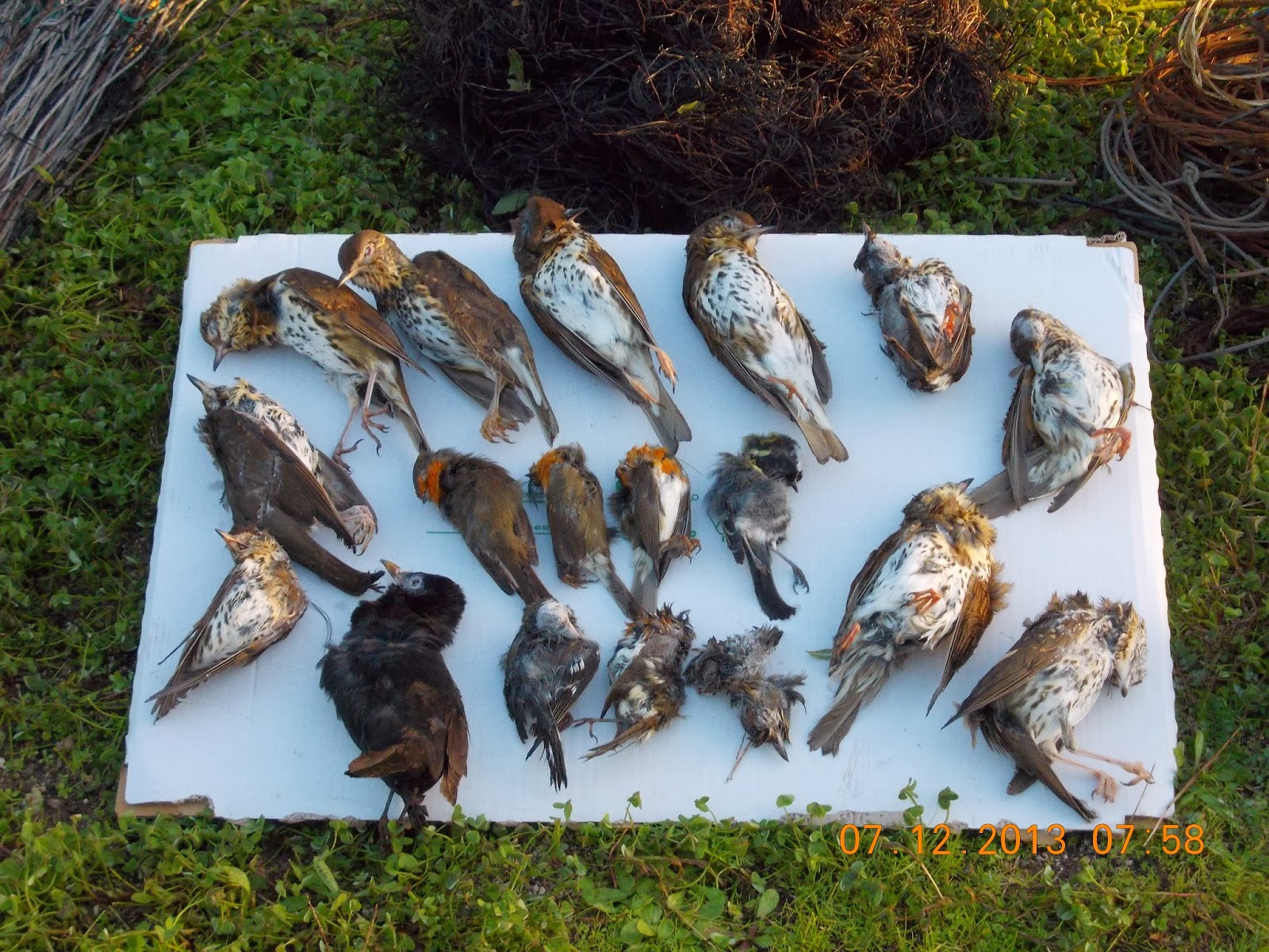 Sono stati liberati dalle trappole 1 Cinciarella (Cyanistes caeruleus) e 1 Fiorrancino (Regulus ignicapilla), mentre sono stati rinvenuti numerosi piccoli uccelli privi di vita: 1 Merlo (Turdus merula), 1 Cinciarella (Cyanistes caeruleus), 5 Pettirossi (Erithacus rubecola), 11 Tordi bottaccio (Turdus philomelos), 1 Fringuello (Fringilla coelebs).